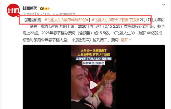 截至2月18日,它的票房直接冲到10.26亿。